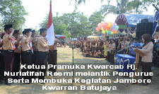 YPK-BATU JAYA--.Jajaran pengurus gerakan Pramuka Kwartir Ranting (Kwarran) Batujaya untuk masa bakti 2012 -2015 secara resmi dilantik dan kepengurus gerakan pramuka tersebut ditetapkan berdasarkan Surat Keputusan Ketua Kwarcab gerakan pramuka Karawang tertanggal 11 September 2012.Prosesi pelantikan dilakukan oleh Ketua Kwarcab Karawang, Hj. Nurlatifah Ade Swara, bertempat di lapangan bumi perkemahan Desa Telukbango Kecamatan Batujaya, Kabupaten Karawang, Sabtu lalu.(28/09)